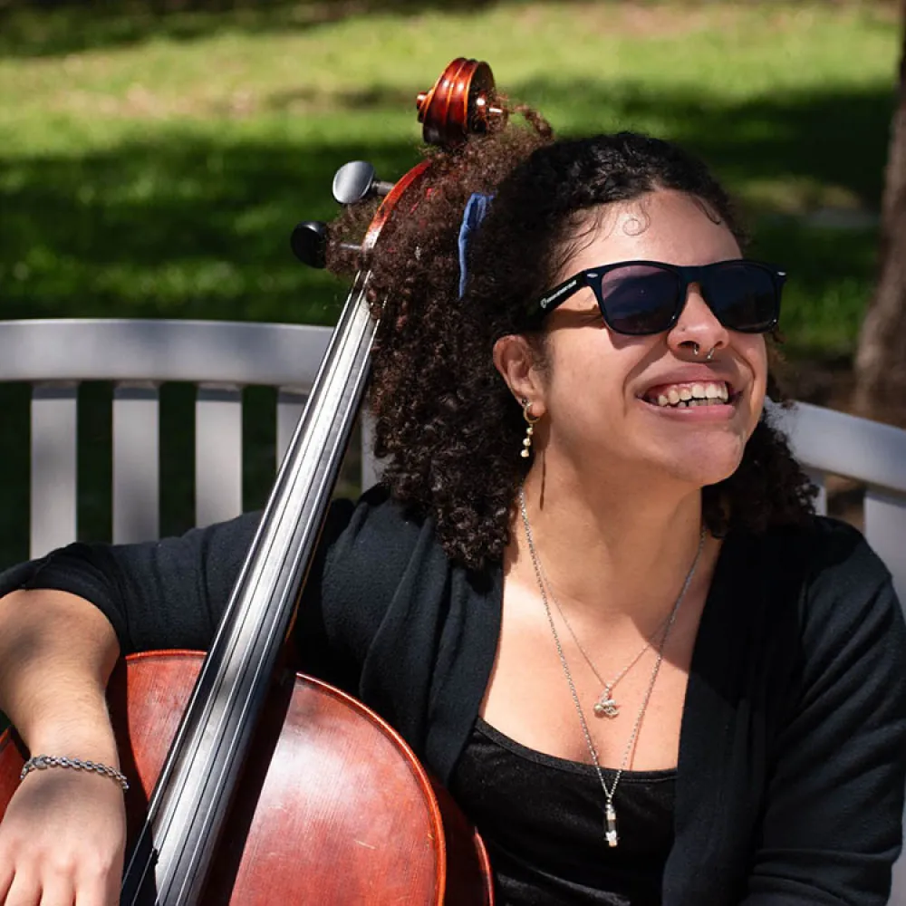 Mika Syms is a cellist and educator from Austin, Texas. She began playing the cello in 2014 with the Kealing Middle School Orchestra, and is an alumna of Austin Soundwaves, having joined the Draylen Mason Fellows Program in 2020. This Spring, she will complete a Music Education degree through the Sarah & Ernest Butler School of Music at The University of Texas at Austin where she studies with Bion Tsang. She teaches various string classes through the UT String Project, and maintains her own private studio. When she’s not playing music, Mika enjoys playing Stardew Valley, listening to punk rock, and collecting plants.