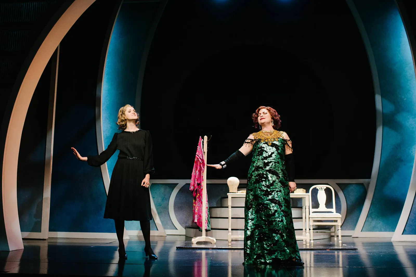 two women stand in a dressing room, doing a dance number