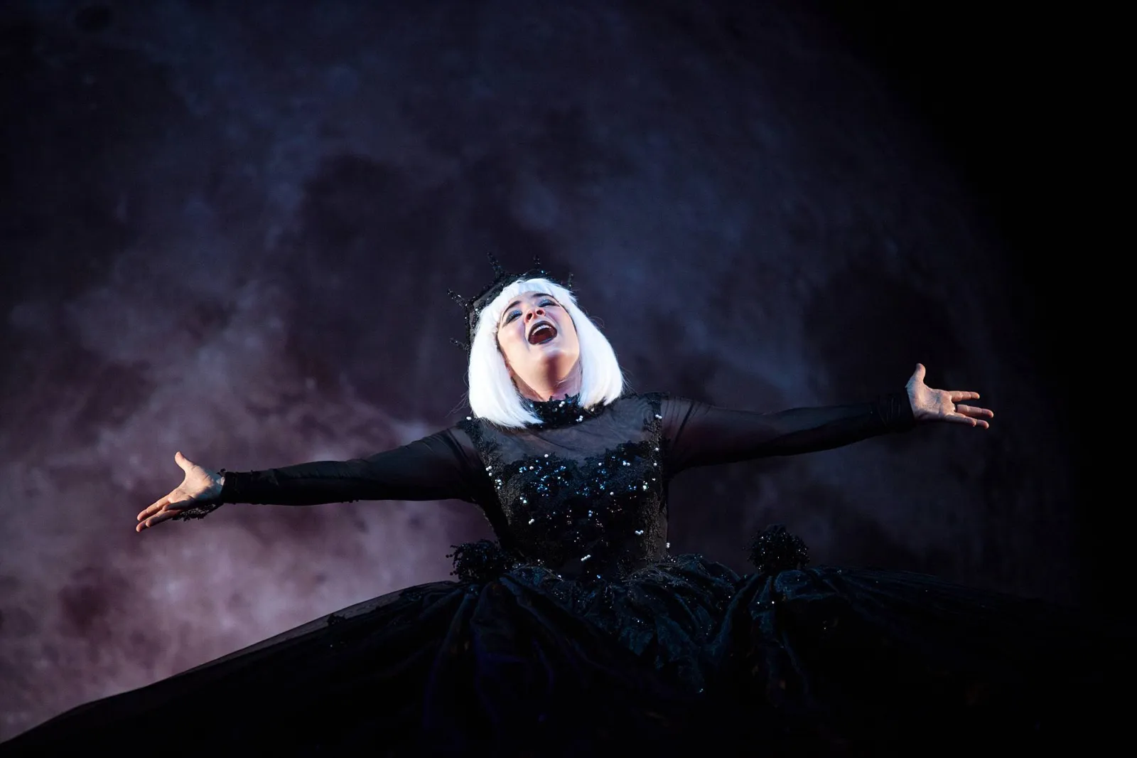 A woman in with stark white hair in a black dress lifts her hands and face skyward on stage.