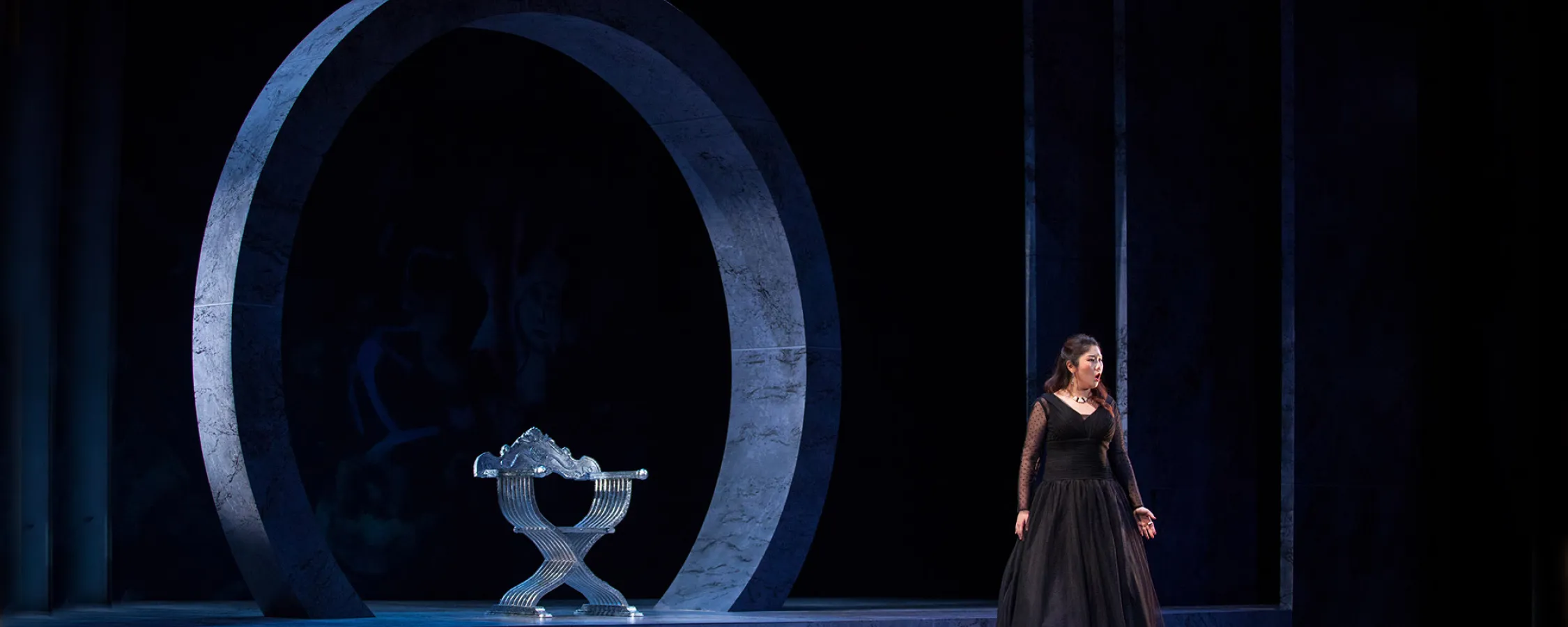 A singer in a white dress stands alone on an expansive set covered in paper, lit with lush blue light. Cursive writing is projected all over the set.