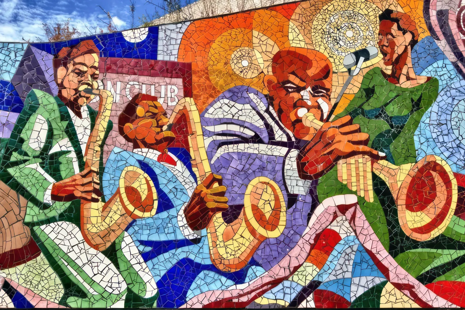 Rhapsody mural detail; 1021 East 11th st. by John Yancey, Luis Alicea, Steven B. Jones