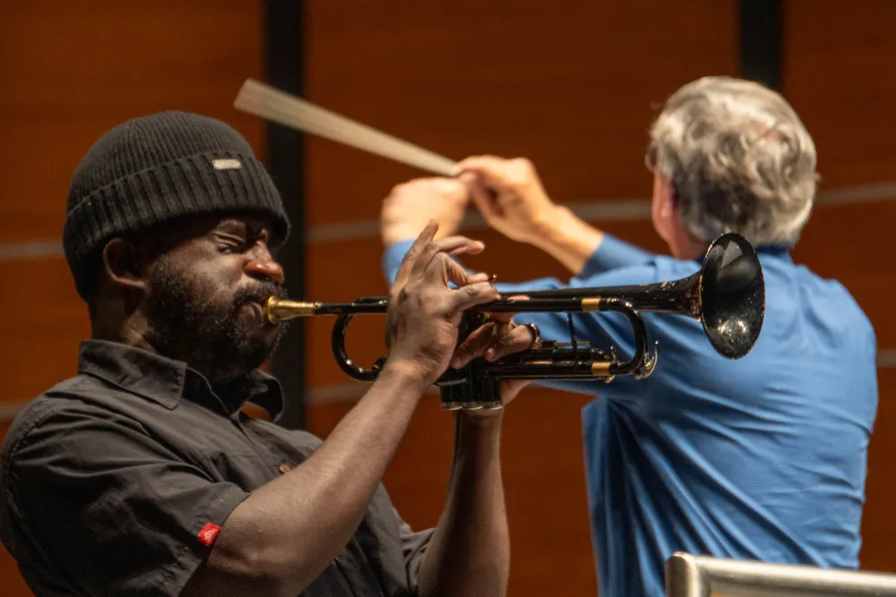 Giveton Gelin plays the trumpet with conductor Peter Bay